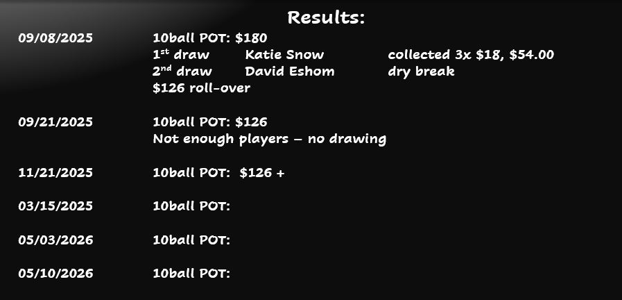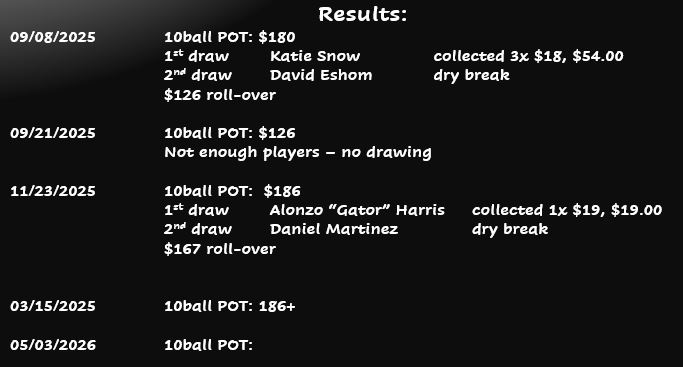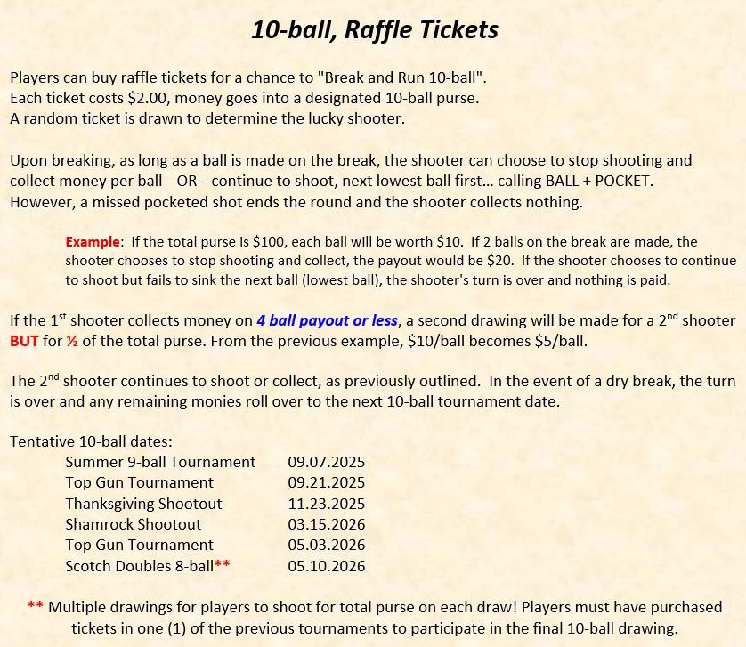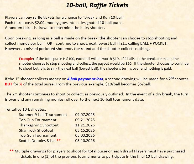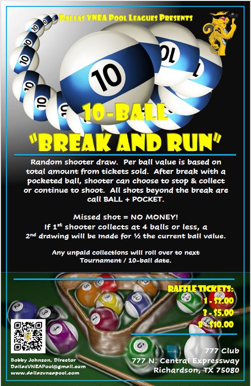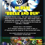 Each tournament date, we’ll have two (2) Raffle Drawings for a chance to win with “10 ball – Break and Run”!