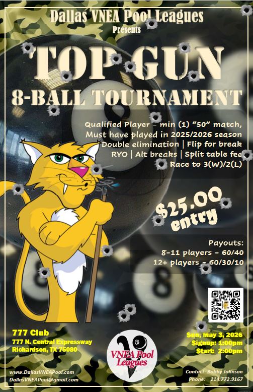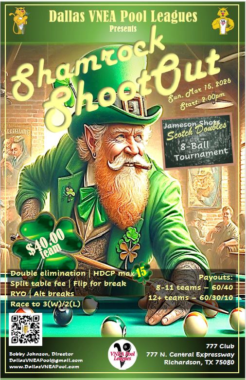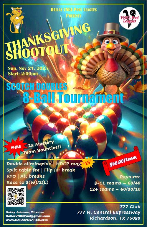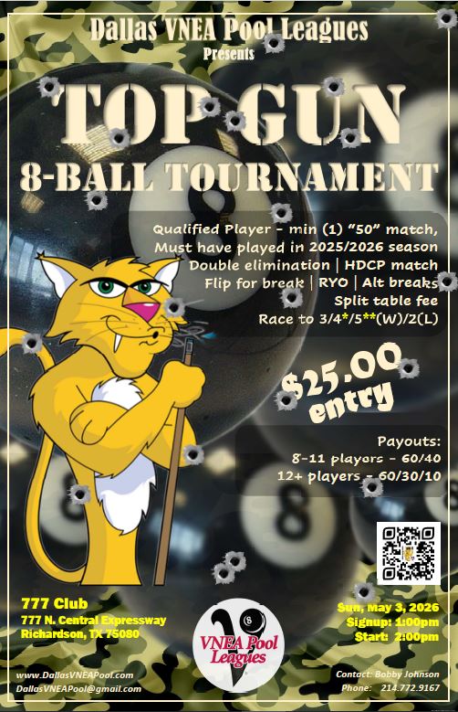 The Dallas VNEA Pool League has been operating in the North Dallas area since 1996. Unlike APA, BCA, TAP, USAPL or other weekly billiards leagues, the VNEA Pool League provides end of season payouts to ALL players! During our end of season Awards Presentation, all players receive CASH payouts based on the number of balls pocketed (points earned). As a non-profit based league, all monies collected, minus league overhead costs, are distributed back to players at an Awards and Recognition Presentation, typically May each year.